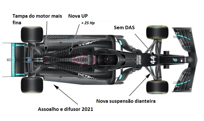 Aerodinâmica é o foco para 2021 Pelo regulamento, a aerodinâmica não entra no congelamento do desenvolvimento e a Mercedes entre uma temporada e outra é sempre capaz de surpreender com o incrível trabalho aerodinâmico que consegue produzir durante o inverno europeu.