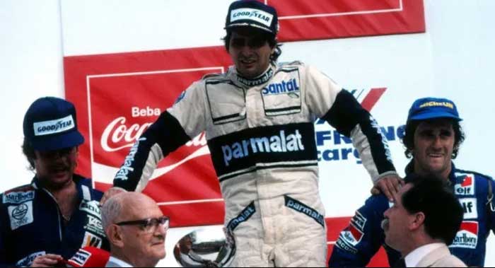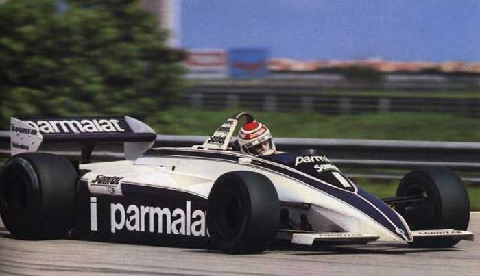 A Brabham. Piquet e o engenheiro Gordon Murray são cheios de truques. Colocaram no monoposto alguns recipientes com água, fazendo a máquina, bastante leve, atingir o peso mínimo exigido pelo regulamento, aval da pesagem obtido, o líquido é descartado. Parece coisa do Dick Vigarista, personagem de desenho animado.