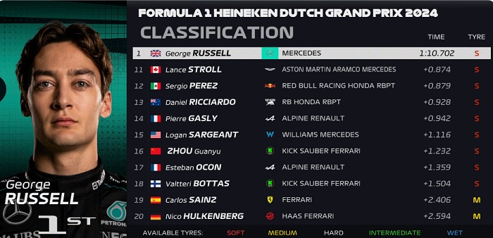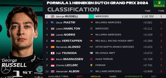 George Russell estabeleceu a volta mais rápida no TL2 do Grande Prêmio da Holanda de 2024. O tempo de volta do britânico foi de 1min10s702. O piloto da Mercedes foi seguido por Oscar Piastri, enquanto Lewis Hamilton fechou o Top 3 da sessão.
