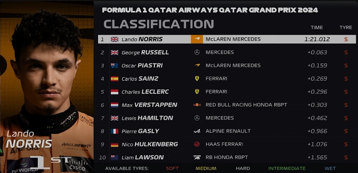 Atrás dos três primeiros, Carlos Sainz foi o melhor da Ferrari, ficando à frente de Charles Leclerc no que foi um resultado decepcionante para a Scuderia. O campeão mundial Max Verstappen só conseguiu colocar seu RB20 em P6, ficando à frente de Lewis Hamilton em P7, enquanto Pierre Gasly, Nico Hulkenberg e Liam Lawson completaram o top 10.