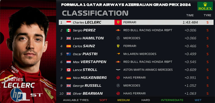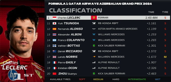 Carlos Sainz foi o quarto, seguido por Oscar Piastri, enquanto o atual campeão mundial Max Verstappen ficou em sexto, mais de meio segundo atrás de seu companheiro de equipe.