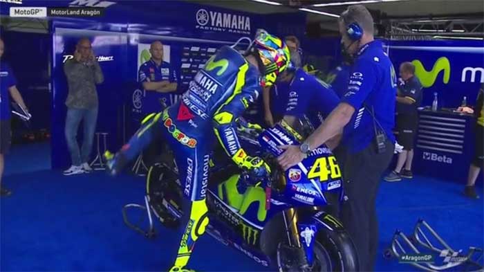 Existem registros que depois da avaliação médica realizada em Motorland ele saiu do Centro Médico utilizando uma muleta no lado esquerdo. É cientificamente impossível reduzir o peso ou provocar qualquer outro benefício na sua perna direita quebrada com este tipo de apoio. No dia da prova, ao montar em sua máquina antes de rumar para o grid, ele fez isso pelo lado direito do equipamento. Apoiou todos os seus 70-80kg de peso sobre a perna direita e girou toda esta massa sobre seus ossos fraturados para jogar a perna esquerda sobre a moto. Doses maciças de analgésicos podem justificar este procedimento, mas com certeza o instinto natural seria subir pelo outro lado para poupar o membro machucado. A pista de Aragon é no sentido anti-horário, ou seja, privilegia curvas para a esquerda que, por consequência, exigem maior apoio da perna direita para mudar a posição do corpo sobre a moto, Valentino não demonstrou dificuldades de movimentação em nenhum momento. Na prova ele também usou sem problemas o membro sinistrado como freio aerodinâmico nas aproximações das curvas. Quando desceu da máquina já no box no final da prova, de novo apoiou todo o corpo na perna direita.
