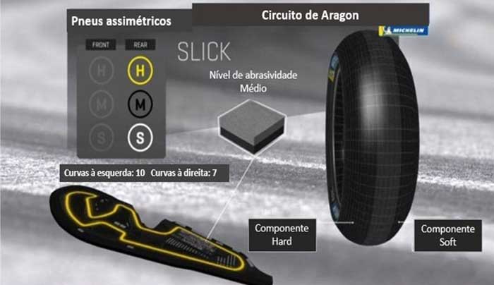 Para evitar as deformações nas frenagens, as carcaças são montadas com fibras sobrepostas de materiais desenvolvidos em pesquisas aeroespaciais. Os pneus da MotoGP conseguem manter a temperatura por mais tempo e sua frenagem é mais modulável, entretanto o desenho “bicudo”, para dar mais área de contato nas curvas, dificulta a dirigibilidade nas frenagens mais fortes.