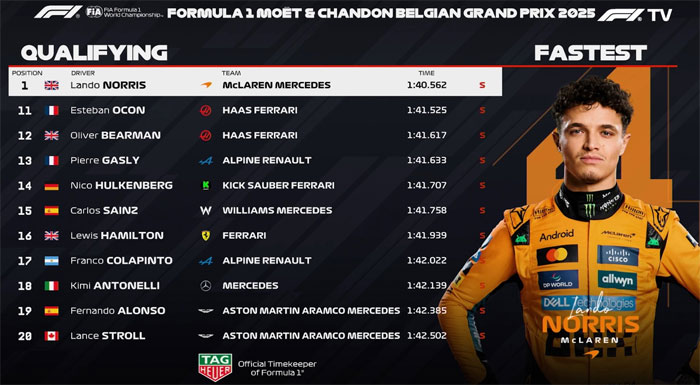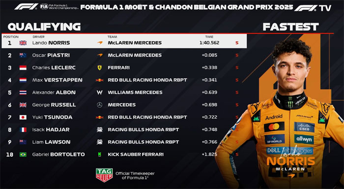 Com esse resultado, Norris se recupera após a derrota na classificação sprint do dia anterior. Assim, a McLaren confirmou seu domínio em Spa, ao menos em uma volta rápida.