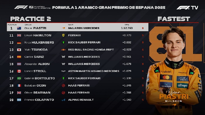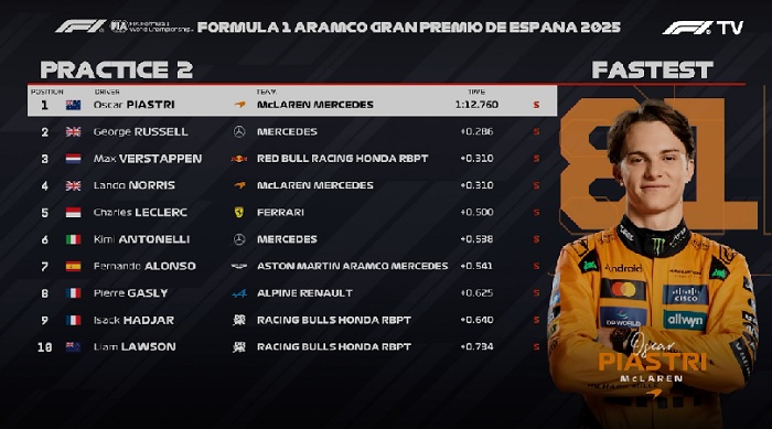 A McLaren manteve a liderança na segunda sessão de treinos livres para o Grande Prêmio da Espanha. Mas, ao contrário da primeira hora de treinos, Oscar Piastri terminou o dia em Barcelona como o mais rápido entre os dois pilotos do MCL39.
