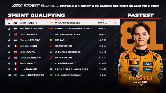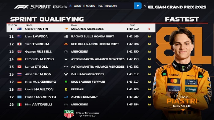 Oscar Piastri conquistou a pole da corrida sprint em Spa-Francorchamps com uma vantagem expressiva de mais de quatro décimos sobre Max Verstappen e Lando Norris.