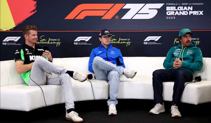 George Russel (centro) na coletiva de imprensa hoje em Spa
